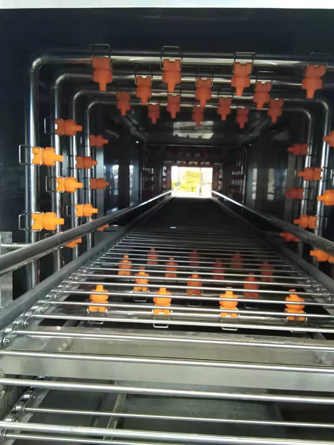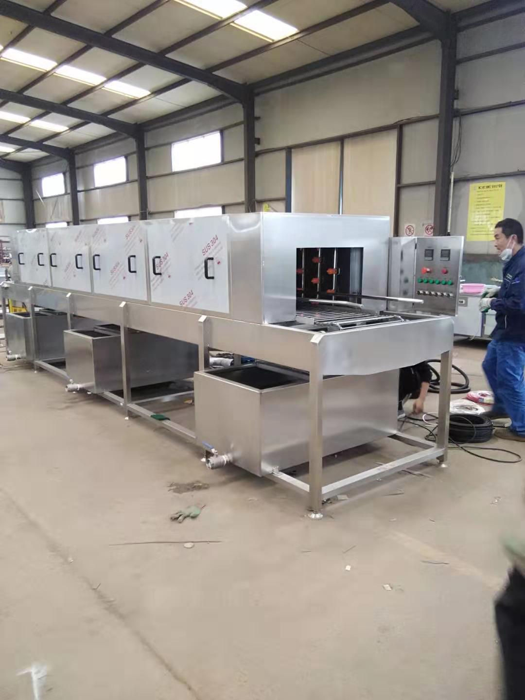 洗框機分多短時,每段配有獨立的循環泵、水箱和噴淋管。這樣每段為一個獨立的清洗系統,可根據實際情況運行其中一段或幾段;個水箱上配有濾網,可實現水的循環利用;噴淋管上配有噴頭,可自動調節方向,從而實現無死角噴淋水,使周轉筐沖洗更干凈。