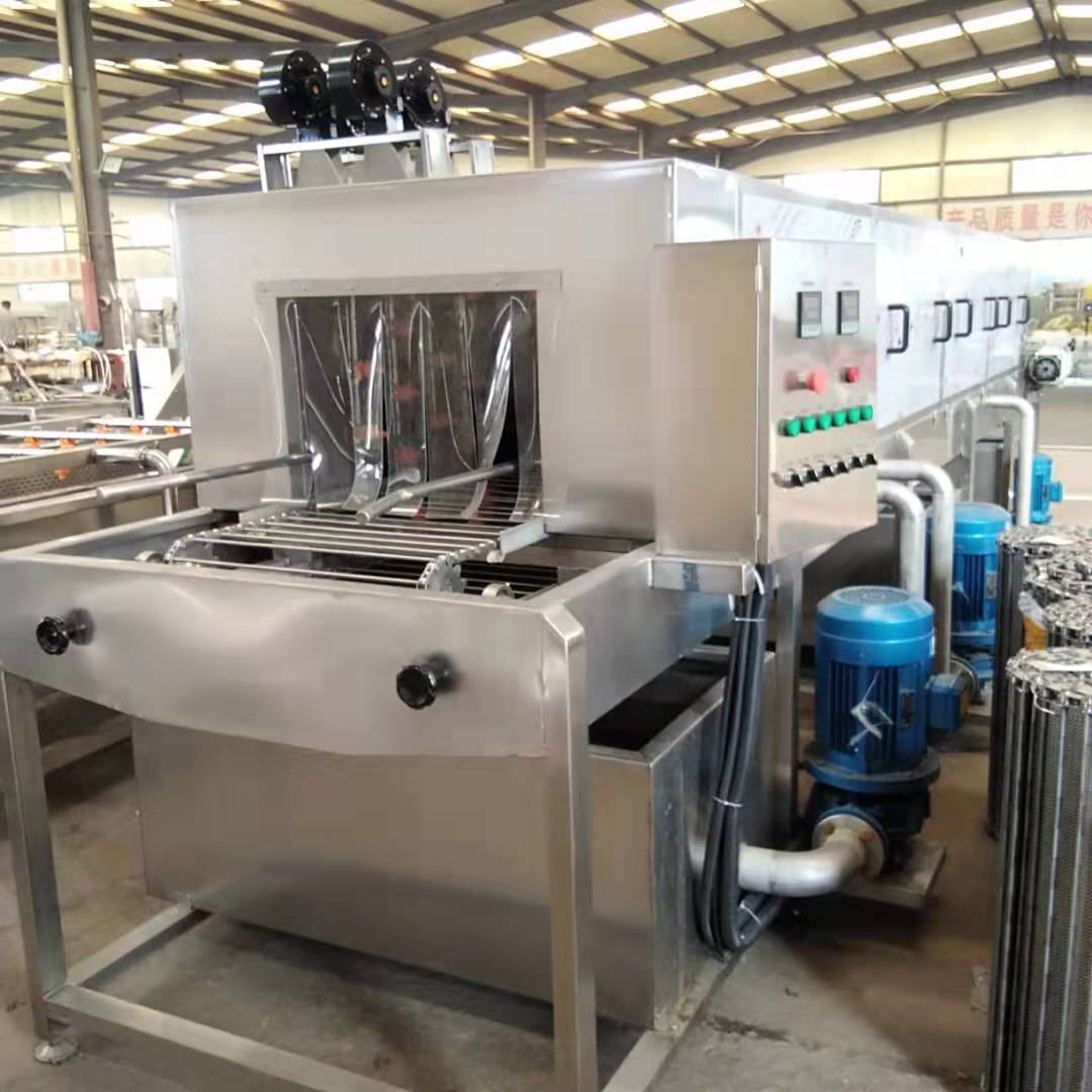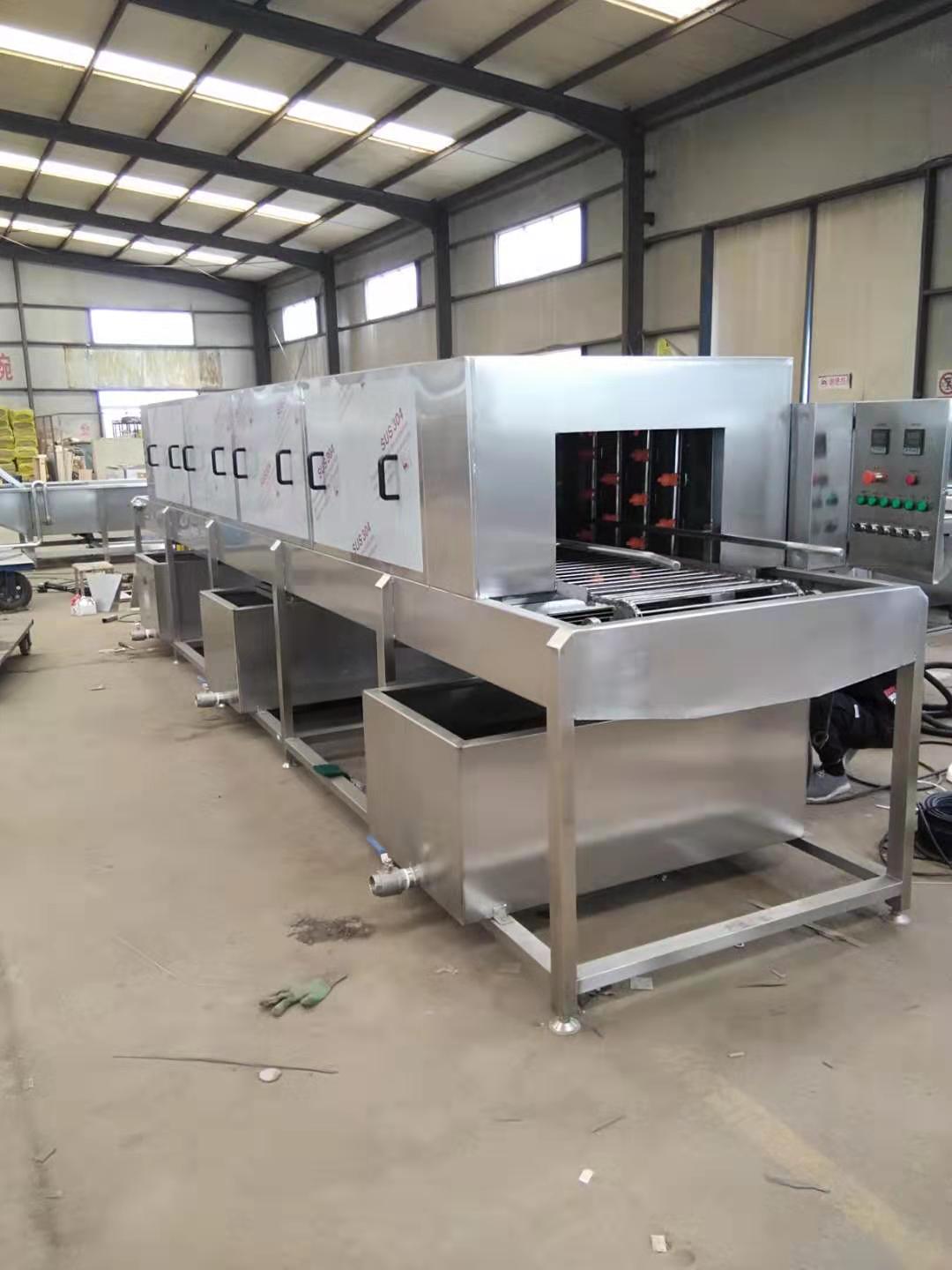 洗框機根據周轉筐尺寸定做,配有傳動系統,將周轉筐放到輸送帶上,跟著輸送帶進入各個洗滌段后輸出。輸送速度可調,可根據周轉筐污漬的輕重調節輸送速度。